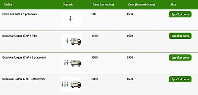 Dodávka Furgon 17m³ + 3 pracovníci Cena (na hodinu): 2000 Kč Cena (minimální): 1500 Kč